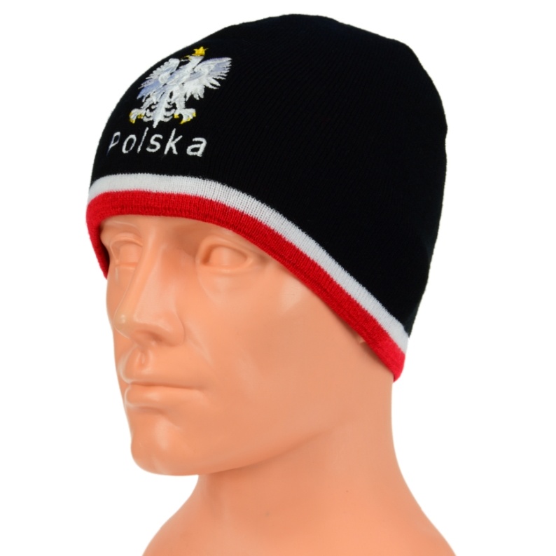 Czapka w kolorze czarnym z orłem i napisem Polska oraz paskiem w kolorze biało-czerwonym.