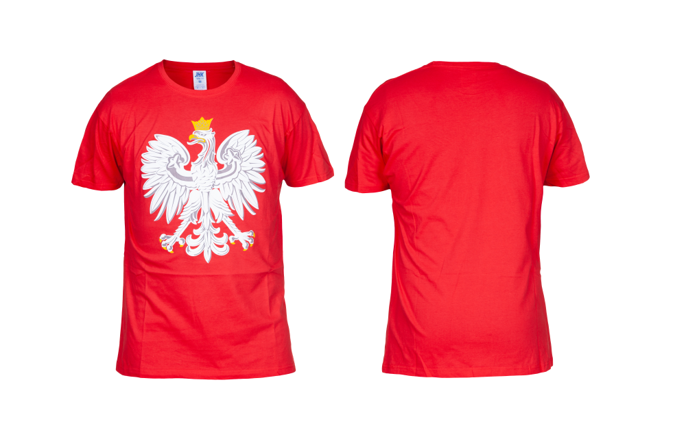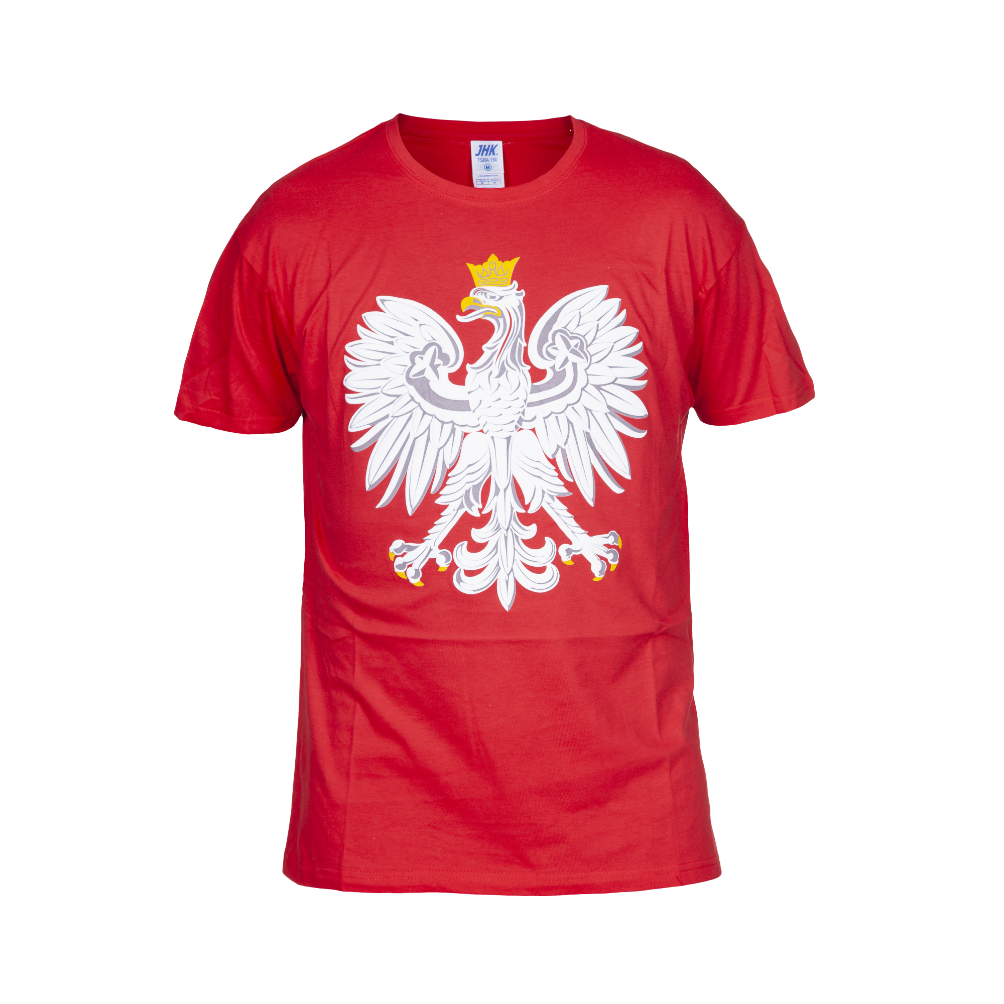 Koszulka bawełniana kibica Polski w kolorze czerwonym z orłem na przodzie.